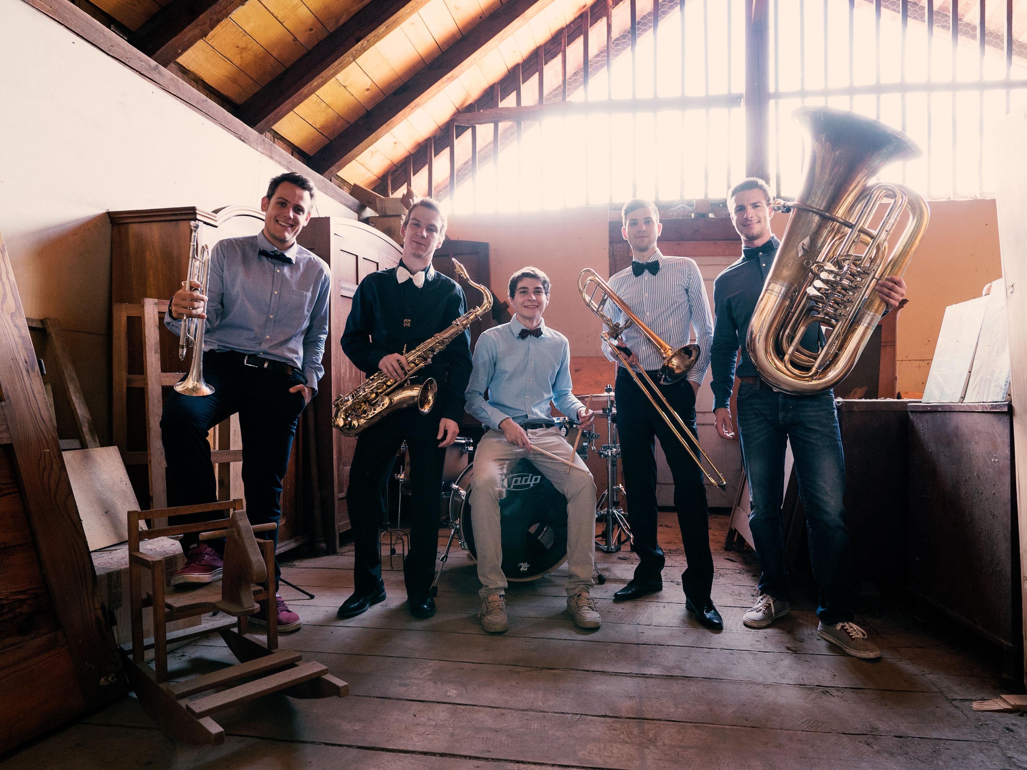 Schillernde Blechbläser spielen zusammen mit Saxophon und Schlagzeug brillante Stücke für Jung und Alt, für Rocker und Jazz-Liebhaber, für abgebrühte Zeltfestbesucher genauso wie für gemütliche Blasmusikgenießer.